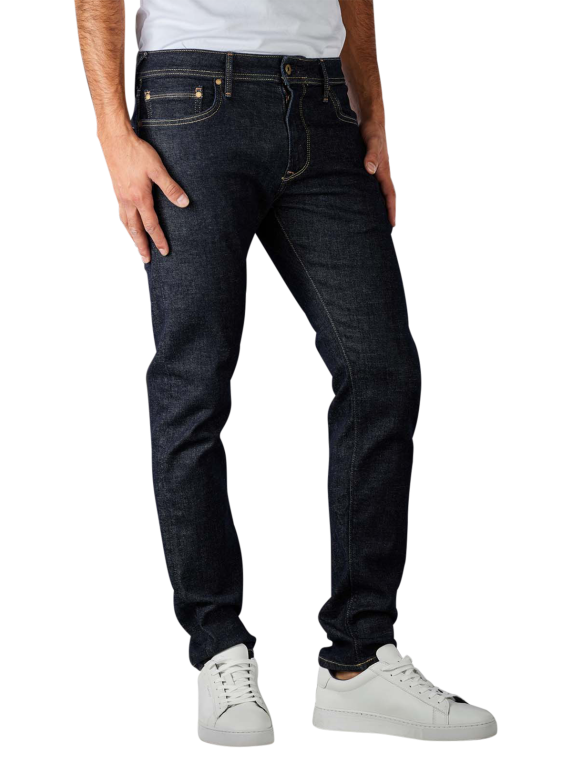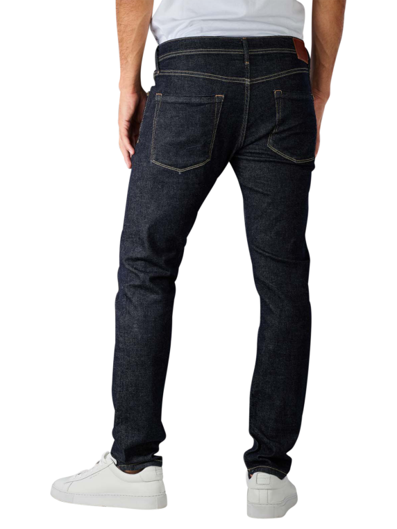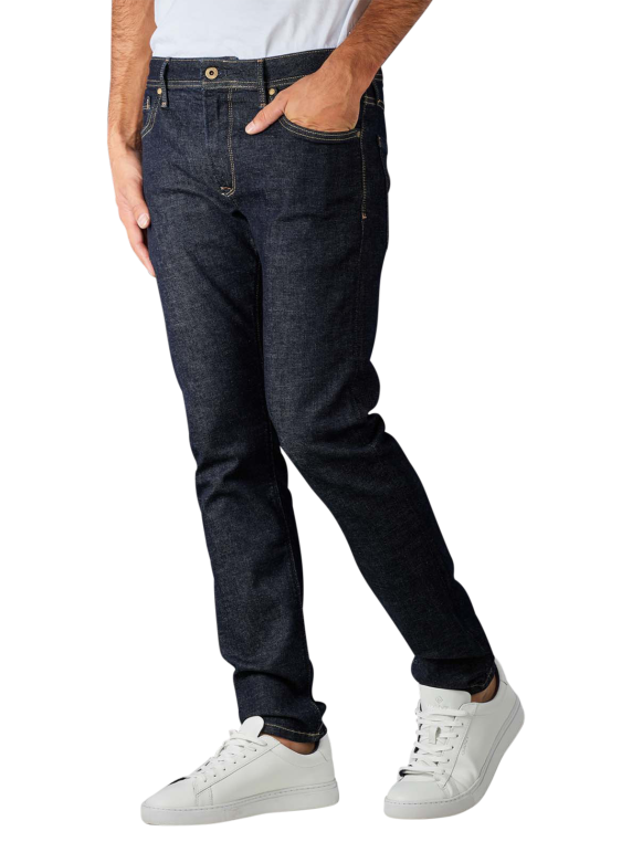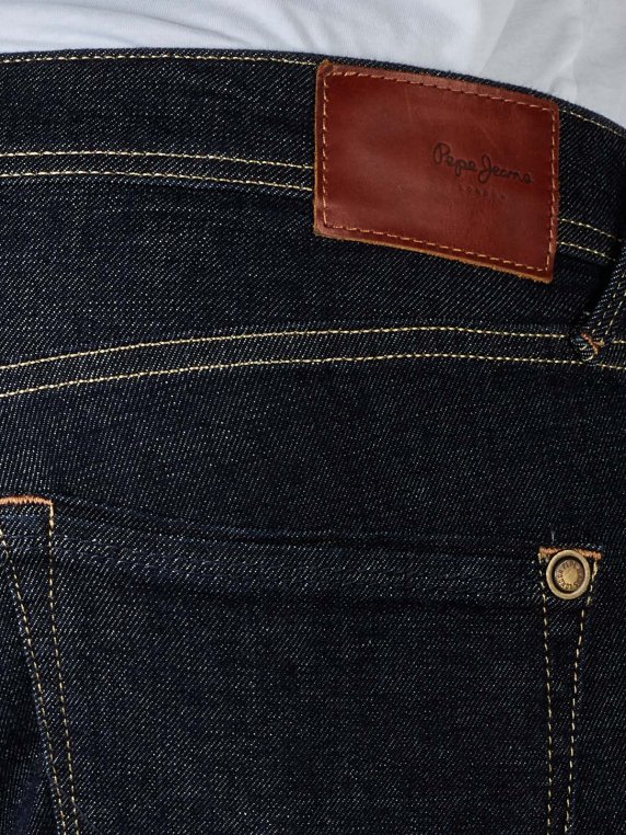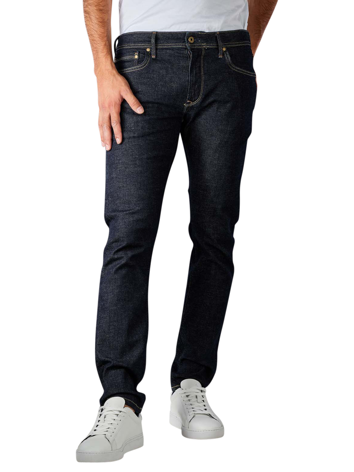 Die Pepe Jeans Stanley Jeans Tapered Fit hat eine dunkelblaue Waschung mit Kontrast-Nähten. Sie ist im Tapered Fit am Oberschenkel gerade und am Bein eng geschnitten. Der Bund ist mittelhoch und die Jeans wird mit einem Reissverschluss und einem Knopf verschlossen. Im hinteren Bund ist ein braunes Pepe Jeans Logo eingenäht.