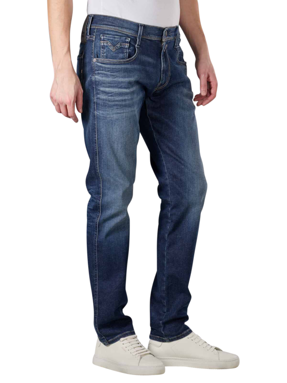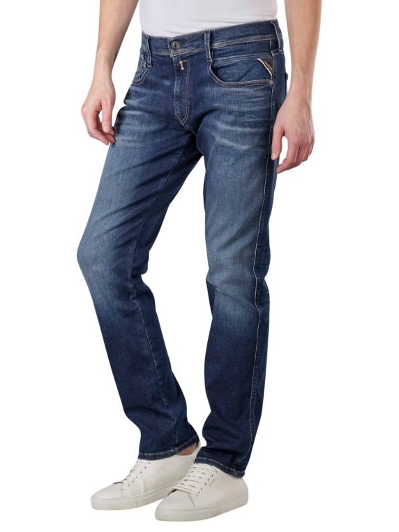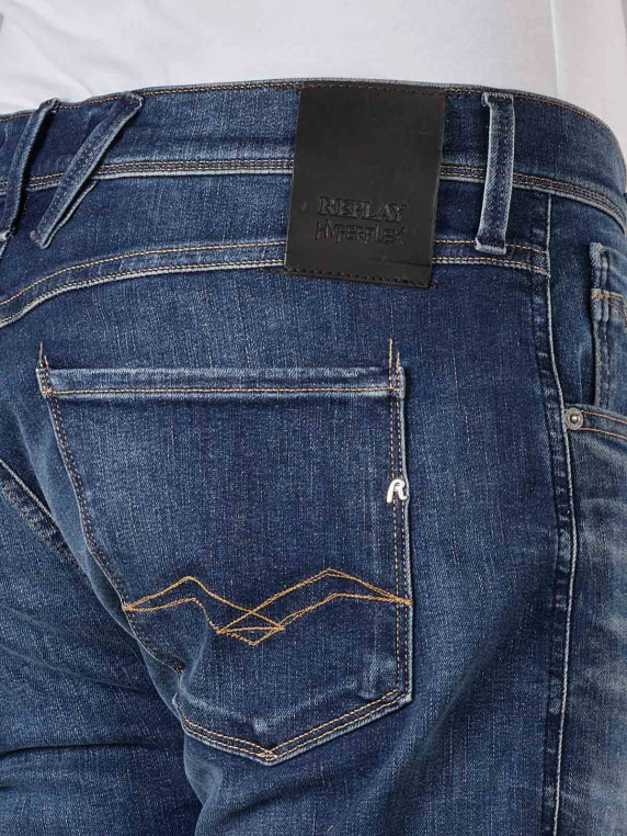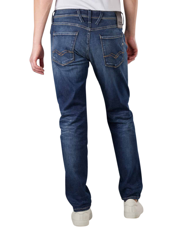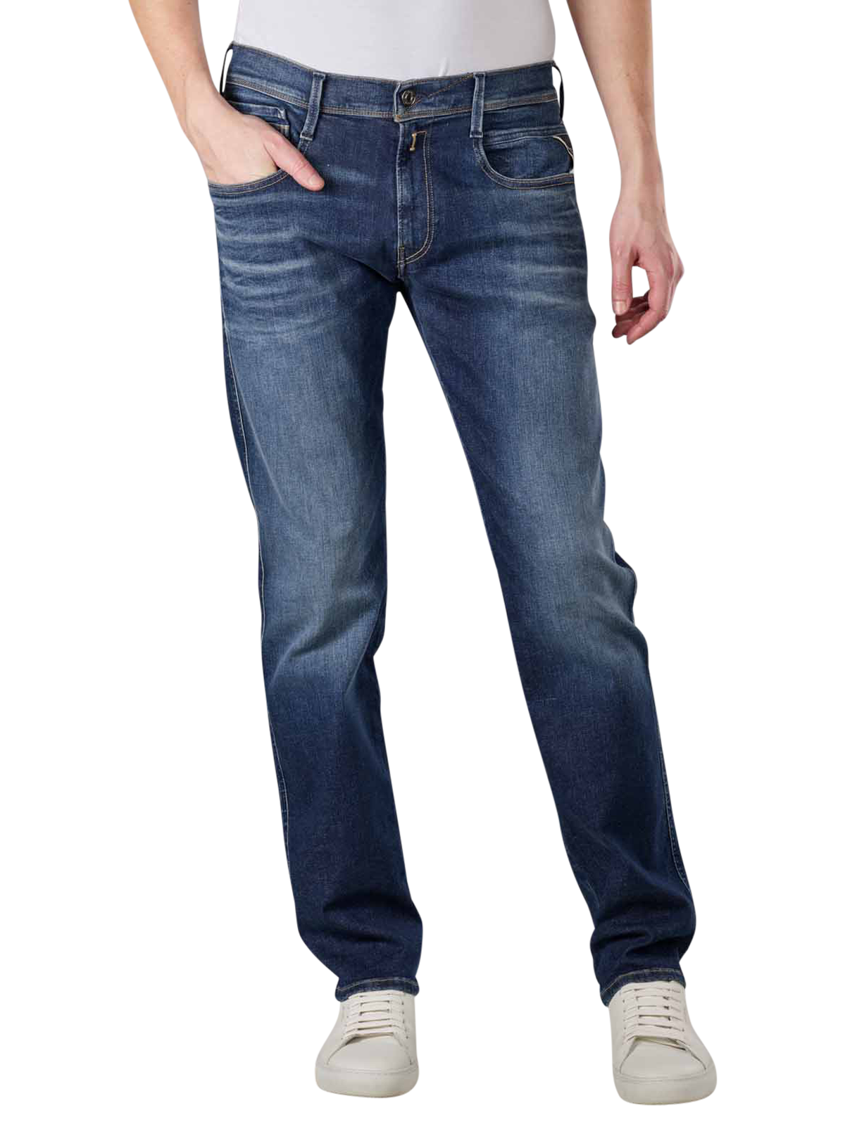 Die Replay Anbass Jeans in Dark Blue ist eine locker sitzende Jeans im Casual-Stil. Geschnitten ist diese Five-Pocket-Jeans von Replay in der Passform Slim Fit mit enger anliegenden Oberschenkeln, einem engen Beinausschnitt und einer mittleren Bundhöhe. Im Schonwaschgang der Waschmaschine kann die Replay Anbass Jeans bei 30 Grad gewaschen werden. Sie besteht aus 91 % Baumwolle, sechs % Elastomultiester und drei % Elasthan und sitzt daher bequem.