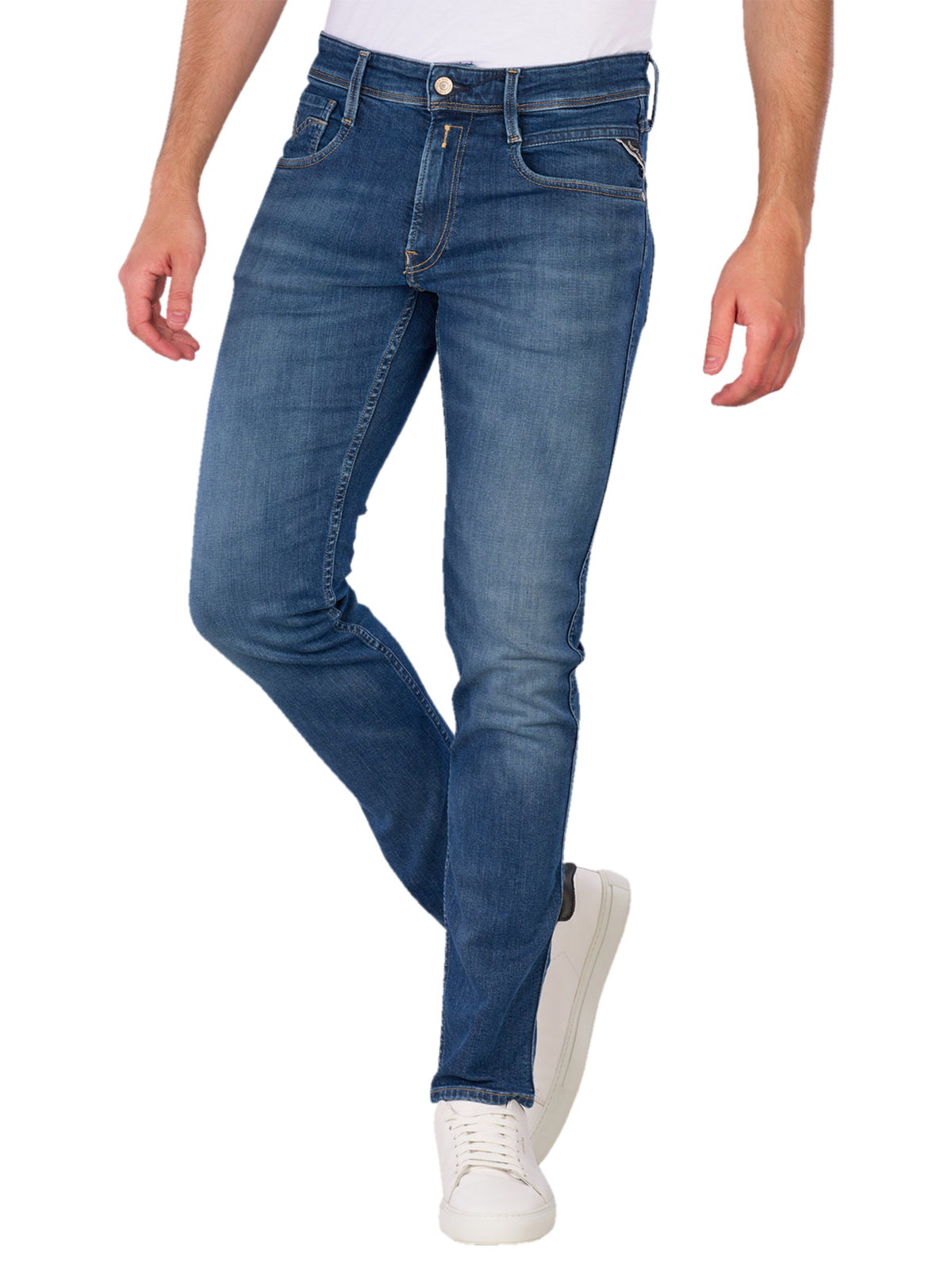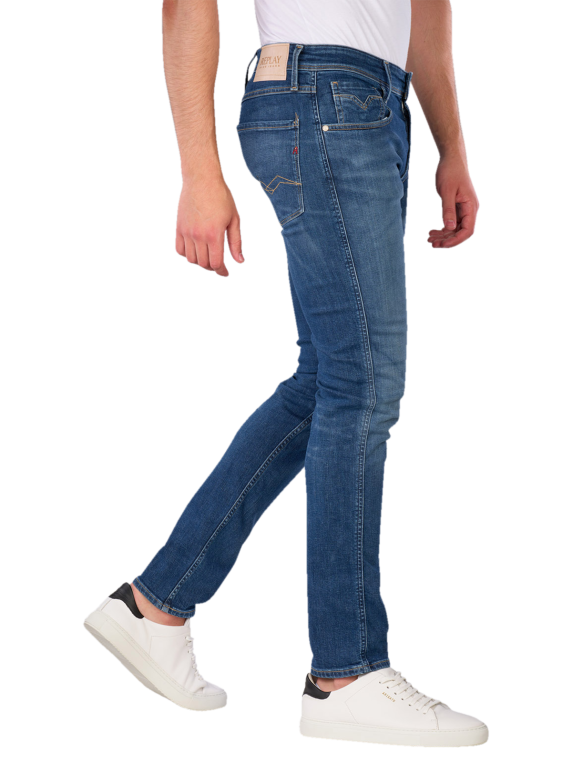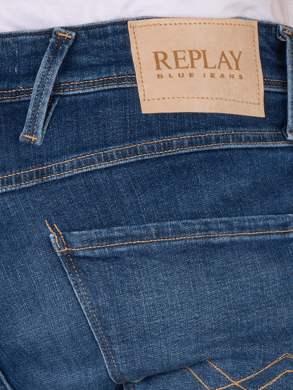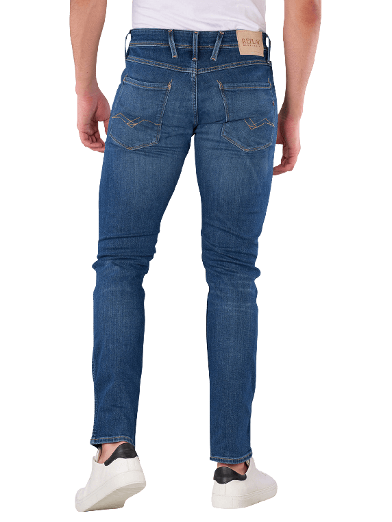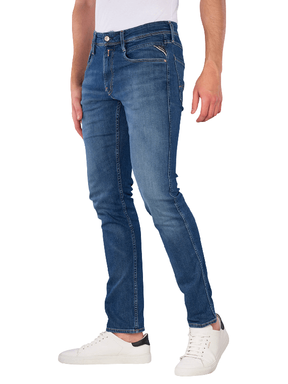 Die Replay Anbass Jeans Slim Fit in Mittelblau bieten eine moderne Passform mit einem engen Beinausschnitt und mittlerer Bundhöhe. Diese Jeans sind mit einem praktischen Reissverschluss ausgestattet und verfügen über fünf Taschen für zusätzlichen Stauraum. Der Stretchanteil sorgt für hohen Tragekomfort und Bewegungsfreiheit. Ideal für den Alltag oder legere Anlässe, lassen sich diese Jeans vielseitig kombinieren.