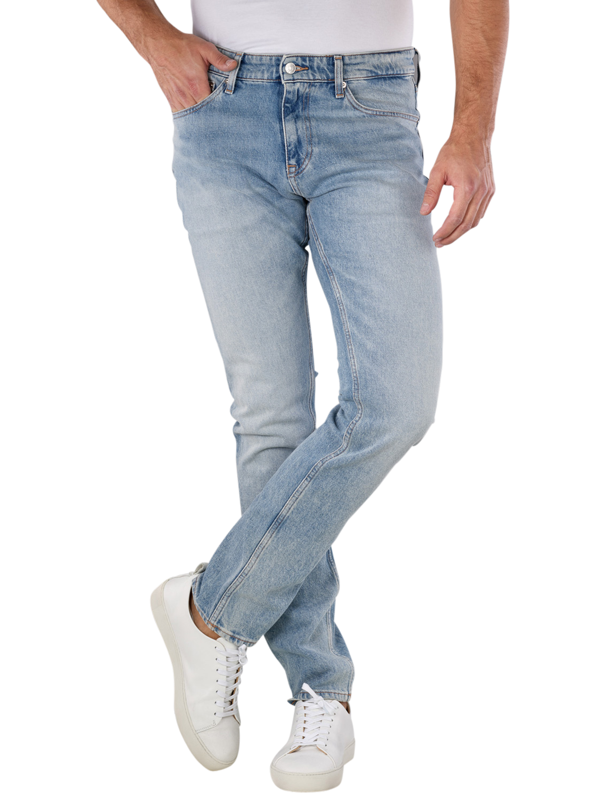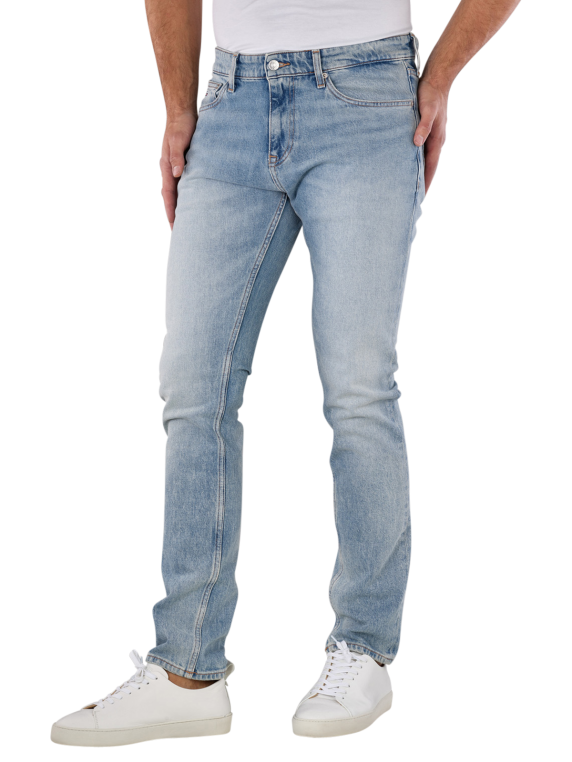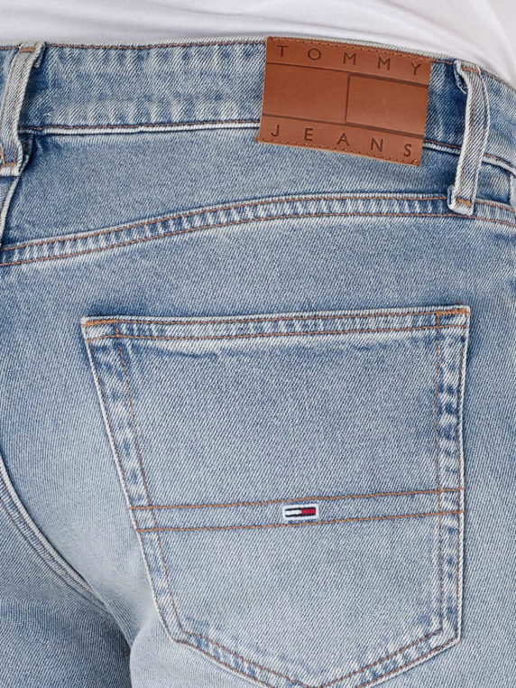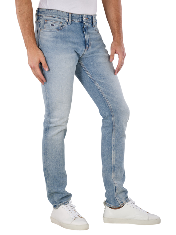 Tommy Jeans Scanton Slim Fit Denim Light bietet eine schmale Passform mit mittlerer Bundhöhe und engem/geradem Beinausschnitt. Die hellblaue Jeans für Männer besteht aus 99% Baumwolle und 1% Elasthan, was für Stretchanteil und hohen Tragekomfort sorgt. Mit Five-Pocket-Design und Reissverschluss sowie heller Waschung ist sie ideal für den Alltag. Pflegeleicht im Schonwaschgang bei 95% und nicht bleichen.