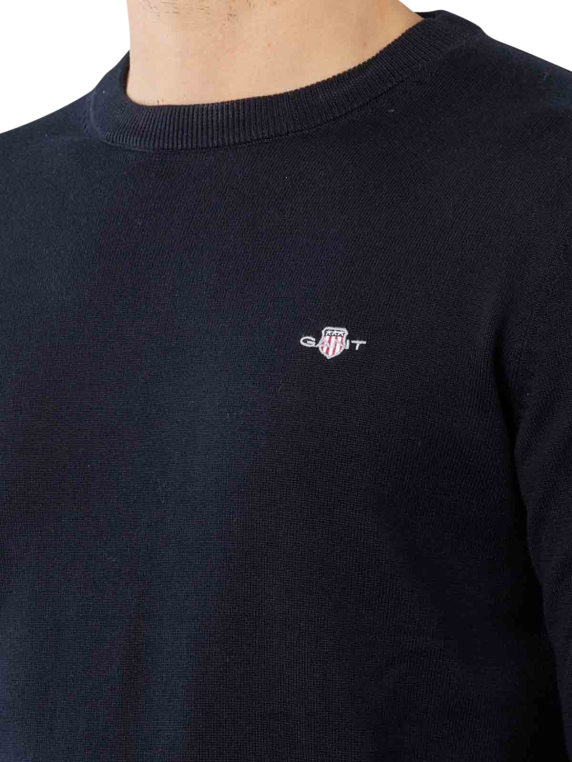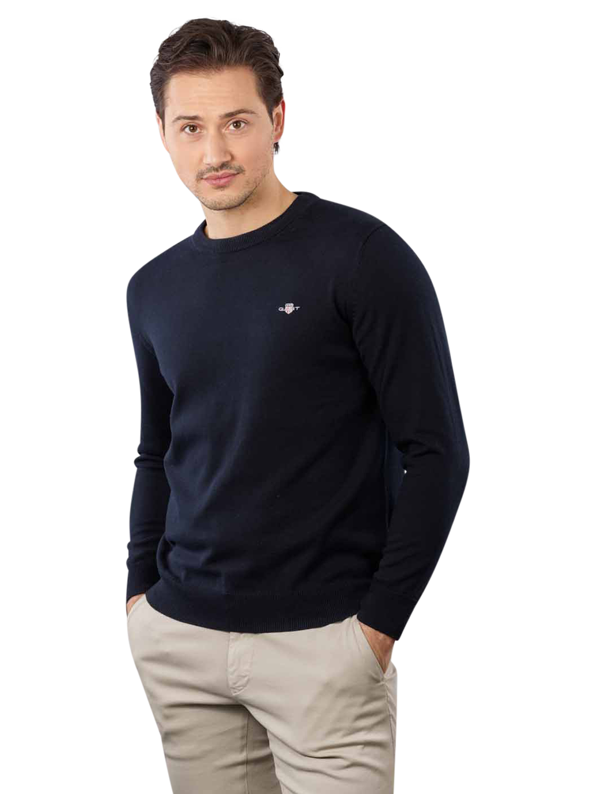 Dieser Pullover von Gant ist in der Farbe Navy gefertigt und besitzt auf der linken Brustseite gut sichtbar das Gant-Logo. Der Pullover ist im klassischen Casual-Stil gefertigt und in der Passform Regular Fit geschnitten. Er besitzt lange Ärmel und einen Rundhalsausschnitt. Hergestellt ist dieser klassische Gant Pullover aus 100 Prozent Baumwolle. Daher kann er auch einfach bei 40 Grad im Normalwaschgang der Waschmaschine gereinigt werden.