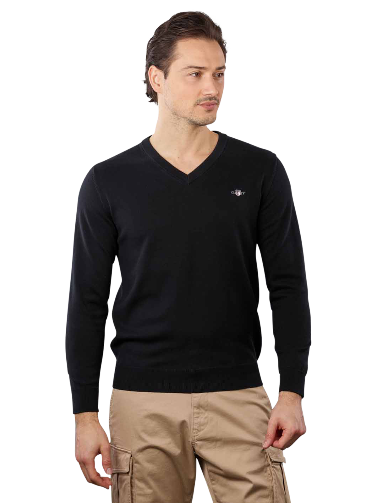 Dieser klassische Pullover von der Marke Gant ist unifarben in Schwarz gehalten. Lediglich das gut sichtbare Logo von Gant ist auf der linken Brustseite aufgestickt. Der Pullover besitzt einen V-Neck-Halsausschnitt und lange Ärmel. Er ist im Casual- und Business-Stil gehalten und in der Passform Regular Fit geschnitten. Der Gant Pullover kann bei 40 Grad im Normalwaschgang gewaschen werden, da er aus 100 Prozent Baumwolle produziert ist.