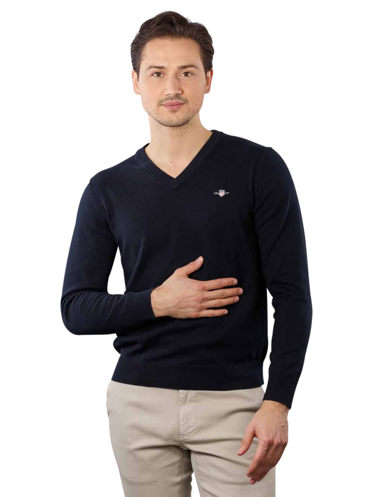 Nicht nur durch den V-Neck-Halsausschnitt ist dieser Gant Pullover ein wahrer Klassiker. Der Strickpullover ist zudem auch unifarben in der Farbe Navy gehalten. Auf der linken Brustseite ist das Gant-Logo jedoch gut sichtbar eingestickt. Geschnitten ist dieser Gant Pullover im Regular Fit, wodurch er bequem sitzt. Gehalten ist er im Casual-Stil. Der Strickpullover besteht aus 100 Prozent Baumwolle und kann daher ganz einfach bei 40 Grad im Normalwaschgang gereinigt werden.