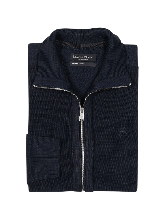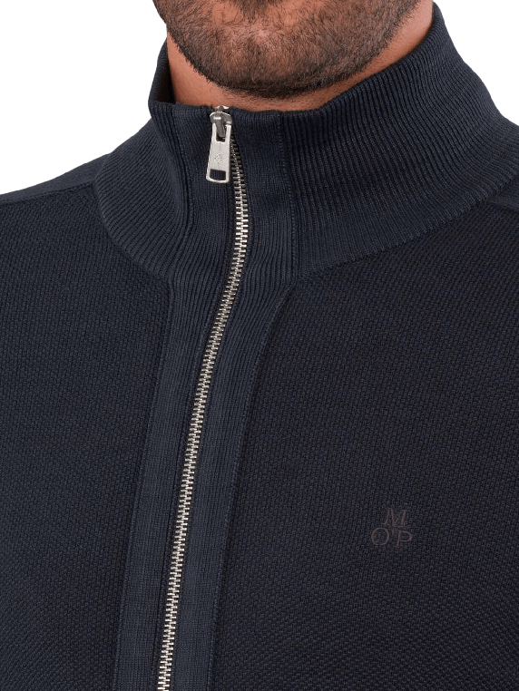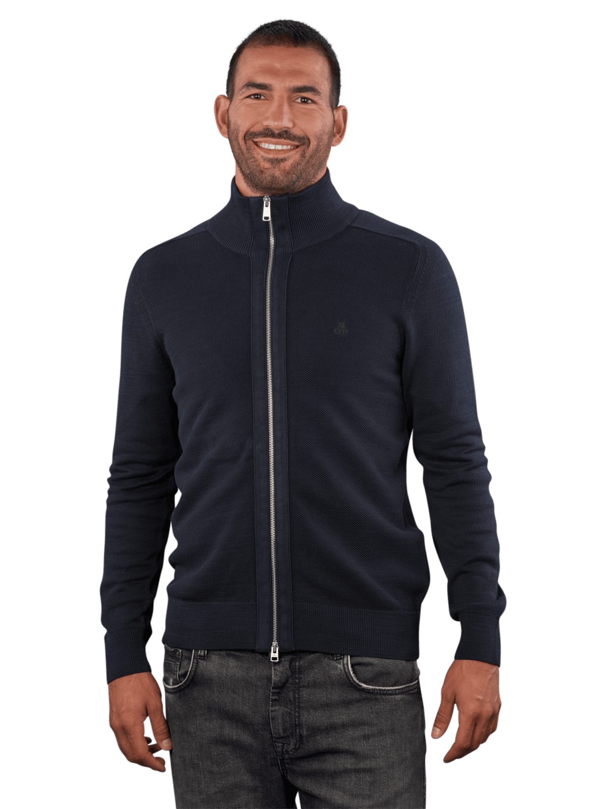 Der Marc O'Polo Cardigan in Dunkelblau bietet eine moderne, strukturierte Pique-Oberfläche und ist aus 100% Bio Baumwolle gefertigt. Er hat keine Kapuze und eignet sich ideal für lässige Anlässe oder als leichte Schicht an kühleren Tagen. Der Cardigan ist pflegeleicht und kann bei 30°C im Schonwaschgang gewaschen werden. Mit dem Global Organic Textile Standard (GOTS) ist er zudem umweltfreundlich.