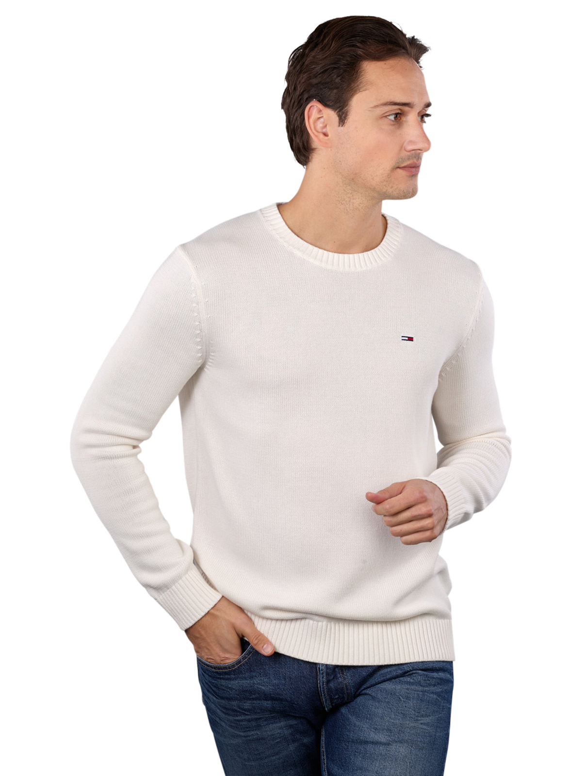 Der Tommy Jeans Slim Sweater Crew Neck in Ancient White (Farbe: Ecru) für Männer ist ein stilvoller Pullover. Mit seiner Rundhals-Kragenform und aus 100% Baumwolle gefertigt, bietet er hohen Tragekomfort. Er eignet sich für den Spezialschonwaschgang bei 30°C und darf nur mit Sauerstoffbleiche gereinigt werden. Ideal für modebewusste Männer, die Wert auf Qualität und Design legen.