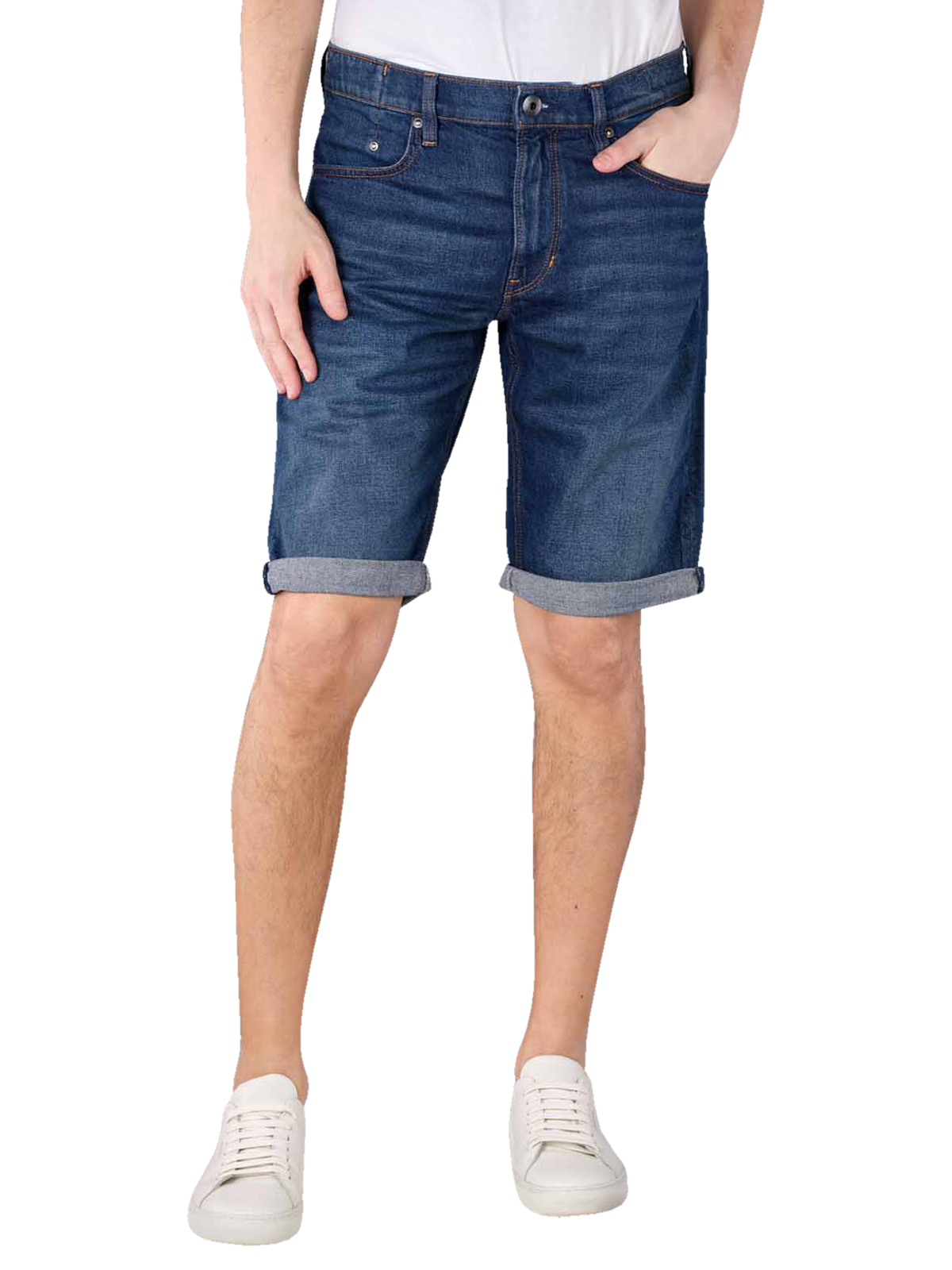 Die Mosa Denim Short von G-Star ist aus Baumwolle mit einem kleinen Elasthan-Anteil. Sie hat eine sehr dezente Used Look Waschung, die allerdings durch Kontrastnähte in kräftigem Orange betont wird. Die Beinausschnitte können umgekrempelt werden, ganz wie es der persönliche Geschmack ist. Das klassische Design der Jeans wird durch den 5-Pocket-Stil und die mittlere Leibhöhe ergänzt. Gewaschen wird die kurze Hose bei 30° C in der Maschine.
