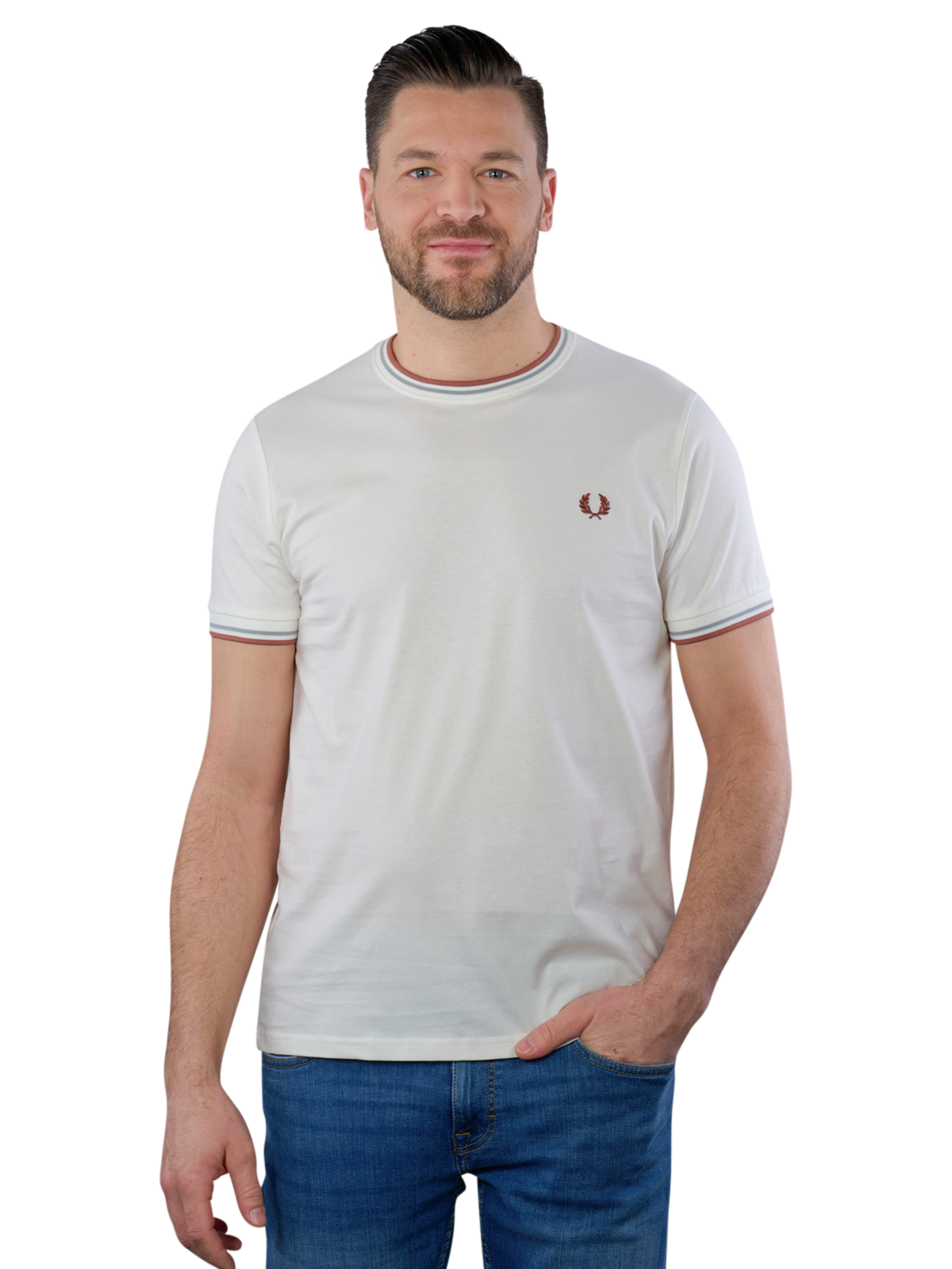 Das Fred Perry Twin Tipped T-Shirt in Light Ecru vereint zeitlosen Stil und hohen Tragekomfort. Hergestellt aus 100% hochwertiger Baumwolle, bietet es ein angenehm weiches Gefühl auf der Haut. Der klassische Rundhalskragen und die typischen Twin-Tipped-Details verleihen dem Shirt eine sportliche Note. Ideal für den Alltag oder entspannte Freizeitaktivitäten, kann es mühelos mit verschiedenen Outfits kombiniert werden. Pflegeleicht und nachhaltig, ist dieses T-Shirt ein Must-have für modebewusste Männer.