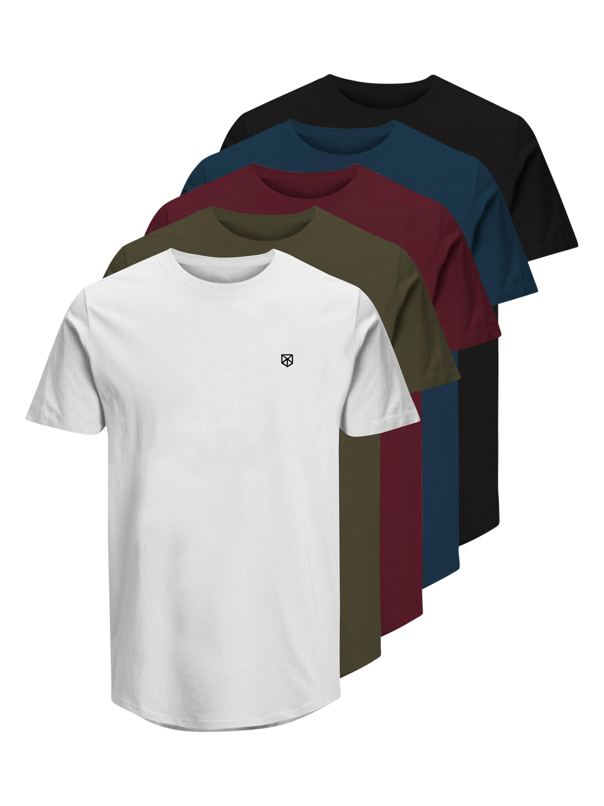 Das Set Jack & Jones Brody Tee SS Crew Neck 5 Pack enthält fünf unterschiedlich farbige T-Shirts aus reiner Baumwolle. Die unifarbenen Regular-Fit-Shirts mit Rundhalsausschnitt tragen einen kleinen Logodruck, der nur dezent sichtbar ist. Die Kurzarm-Shirts können bequem bei 40 Grad gewaschen und bei niedriger Temperatur getrocknet werden.