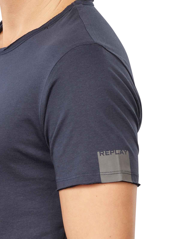 Auch bei Shirts ist der Used Look beliebt. So zeigt sich das Replay T-Shirt M3590 576 mit einem runden Halsausschnitt, der stark ausgefranst ist. So wirkt das Shirt aus reiner Baumwolle, als sei es schon oft getragen worden. Weitere Details sind die Mittelnaht hinten und das Printlogo auf dem linken Arm.