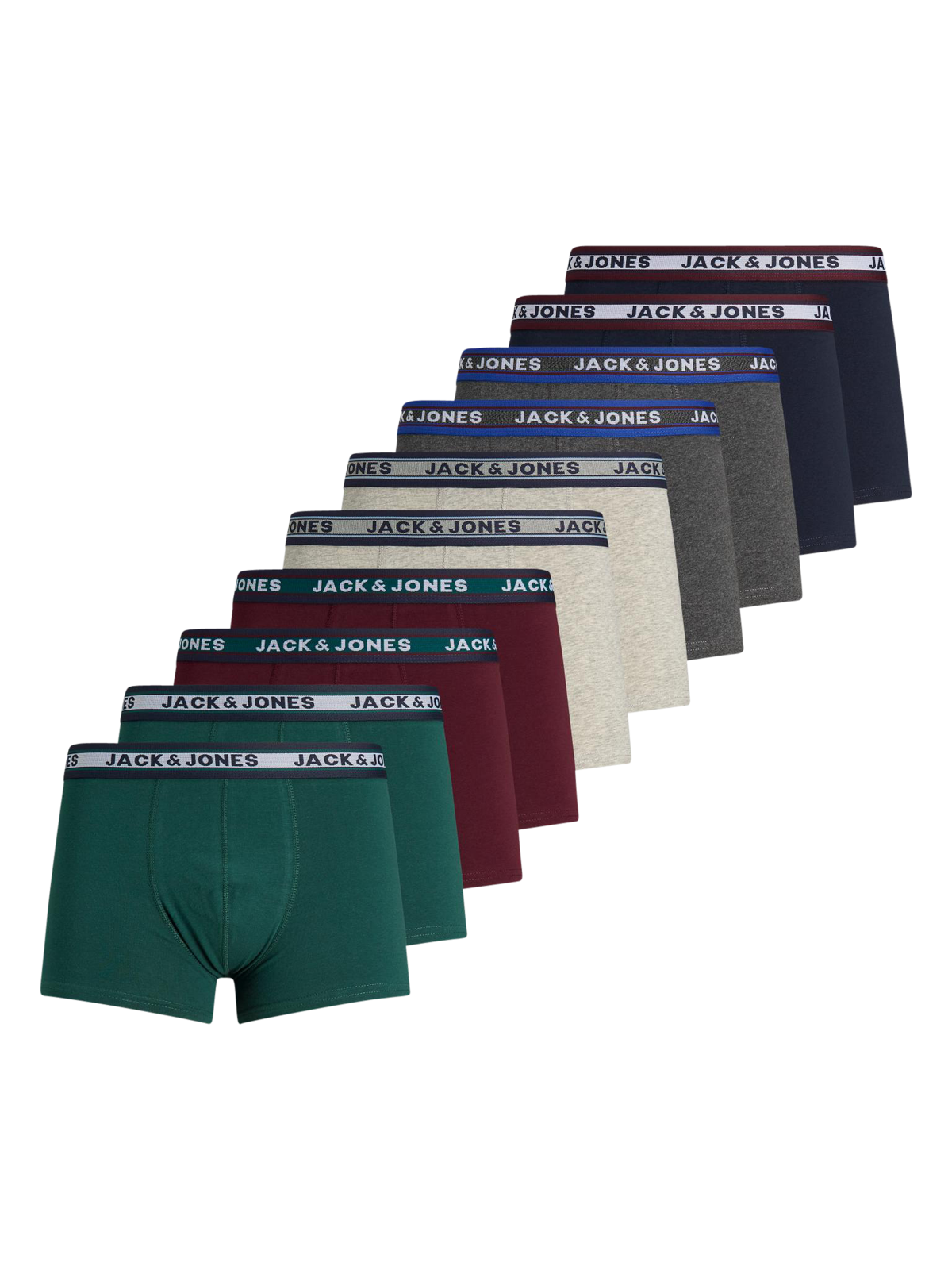 Das Label Jack & Jones steht für praktische, coole Herrenbekleidung. Die Jack & Jones solid Trunks 10 Pack besteht aus 10 Stück Unterhosen in fünf Farben mit dem gut sichtbaren Logo am Hosenbund. Als Farben für die bequemen Hosen wurden Schwarz, Anthrazit, Hellgrau, Grün und Burgund gewählt. Der hohe Baumwollanteil macht die Hosen langlebig und unter jeglicher Jeans oder Hose angenehm tragbar.