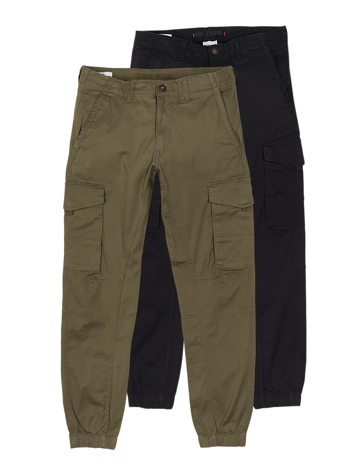 Die Jack & Jones Paul Cargo Tapered Fit Hose im 2er-Pack ist ideal für stilbewusste Männer. Sie kommt in den Farben Schwarz und Oliv und bietet eine enganliegende Passform mit mittlerer Bundhöhe. Der dünne Stoff enthält 2% Elasthan, was für zusätzlichen Stretch sorgt. Diese Cargohose hat einen Reissverschluss und ist bei 40°C im Normalwaschgang waschbar. Ihr Material besteht zu 98% aus Baumwolle.